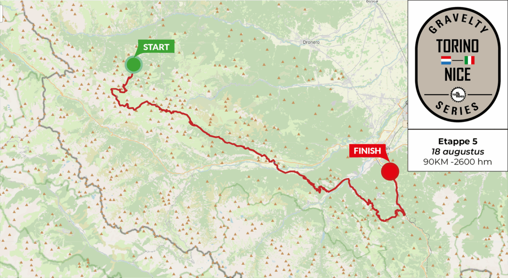In totaal worden 9 cols van hors categorie beklommen, waarvan vijf helemaal of grotendeels onverhard. En daartussenin rijd je over militaire stradas uit de negentiende eeuw en langs ruïnes van oude forten. De route omvat ongeveer 485 km aan asfalt en 240 kilometer rotsachtige, militaire gravel stradas langs de grens van Frankrijk en Italië, vaak op een hoogte van 2.000m of meer. De route bevat twee Grand Tour-cols, met als hoogste punt de 2.750m hoge Col d’Agnel.