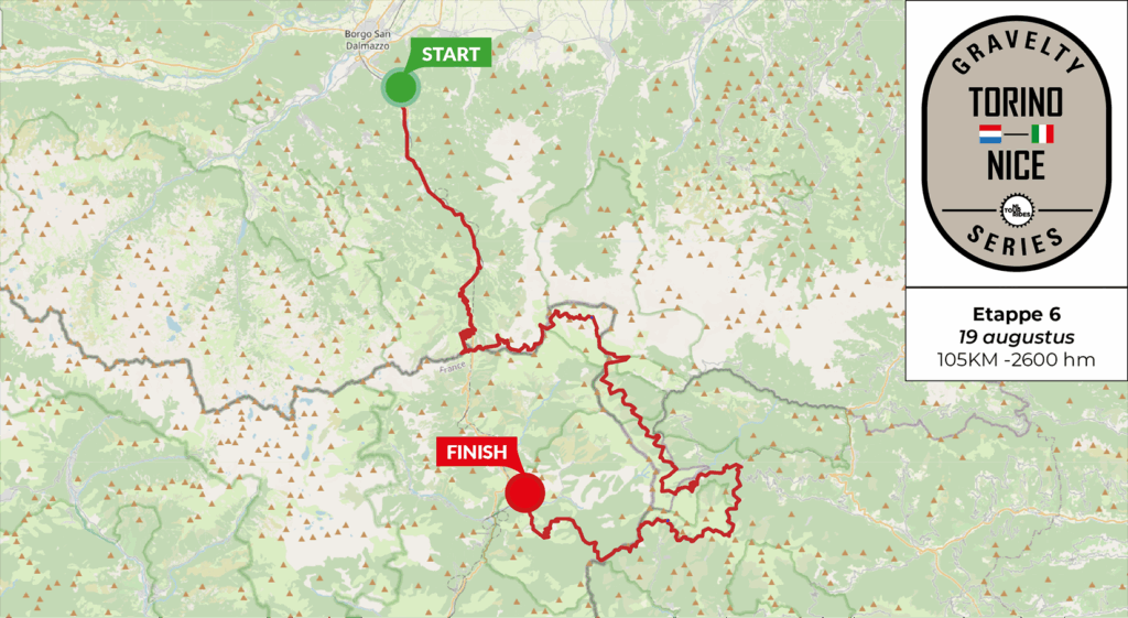 Vandaag begint de dag weer direct met klimmen vanuit het vertrek. De klim verloopt over asfalt, en geniet nog maareven van een gladde weg, want vanaf de Col de Tende zul je voorlopig alleen maar heel veel gravel onder je wielenkrijgen, even onderbroken met wat asfalt.