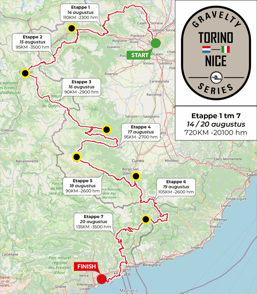 Maar voor velen is deze route met bagage afleggen en zonder support achter de hand, net een stapje te ver. Daarom organiseert NL Tour Rides Gravelty Torino Nice. Daarbij zijn we een samenwerking aangegaan met de mensen achter de originele Torino Nice Rally, waarbij al hun ervaring van groot belang is.